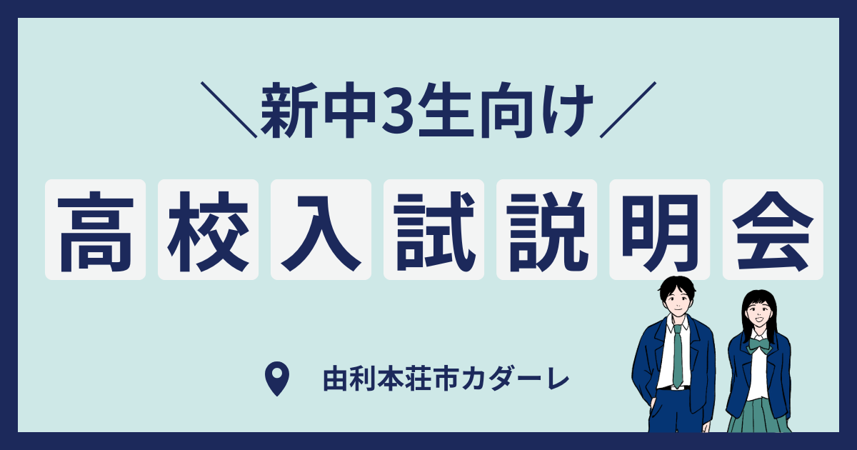 秋田県高校入試説明会を実施 2026 2/15 お知らせ 2026.02.15 由利本荘市「カダーレ」にて新中学3年生向けの高校入試説明会を実施いたします。 お知らせ お知らせ よかったらシェアしてね! URLをコピーしました! URLをコピーしました! 春期講習を開催します この記事を書いた人 wpmaster 関連記事 春期講習を開催します 2026.02.15 本荘駅前店 オープン 2022.10.8 いよいよ夏休み、夏期講習のご案内 2022.07.16 令和4年度高校受験 お疲れ様でした! 2022.03.19 動画「12月まで成績を上げなければいけない理由」 2021.09.10 【高校受験対策シリーズ 寝ちゃう人へ】 2021.09.9 動画 「正しい勉強方法の身につけ方」 2021.09.4 テスト中の見直しについて 2021.08.30